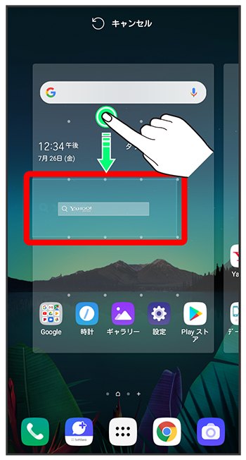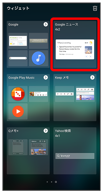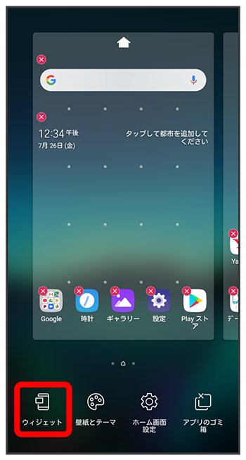 が表示されているウィジェットは、タップするとウィジェットの一覧が表示されます。一覧から追加したいウィジェットをロングタッチしてください。