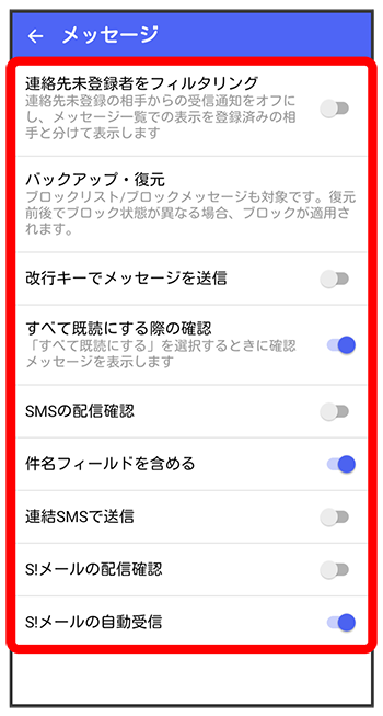 | 連絡先未登録者をフィルタリング | 連絡先に登録していない差出人からのメッセージを、連絡先に登録している差出人からのメッセージと分けて表示するかどうかを設定します。 ONにすると、連絡先に登録していない差出人からのメッセージは通知されなくなります。メッセージ一覧画面でをタップすると、連絡先に登録していない差出人からのメッセージを確認できます。 |