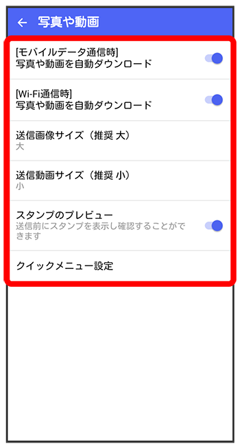 | [モバイルデータ通信時]写真や動画を自動ダウンロード | モバイルデータ通信時に受信した写真や動画を自動でダウンロードするかどうかを設定します。 |