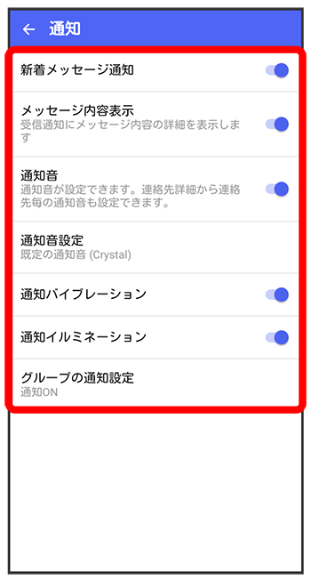 | 通知イルミネーション | メッセージを受信したときに本体のLEDを点灯するかどうかを設定します。 |
