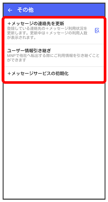 | +メッセージサービスの初期化 | 本体およびサーバー上にあるデータを削除できます。 |
