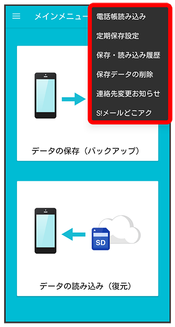 | S!メールどこアク1 | 本体の電話帳データを、「S!メール(MMS)どこでもアクセス」のサーバーにエクスポートします。 |