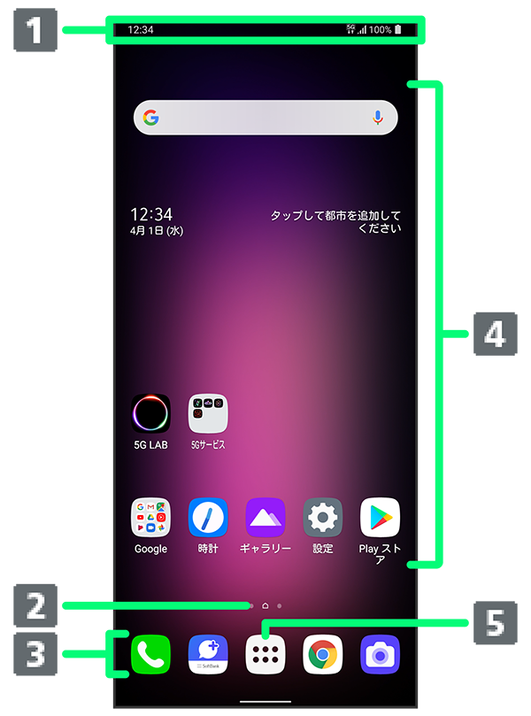 | カスタマイズエリア | アプリのショートカットやフォルダ、ウィジェットを自由に配置できます。 |