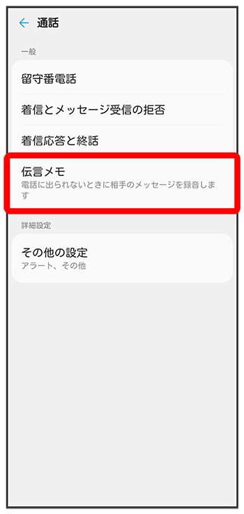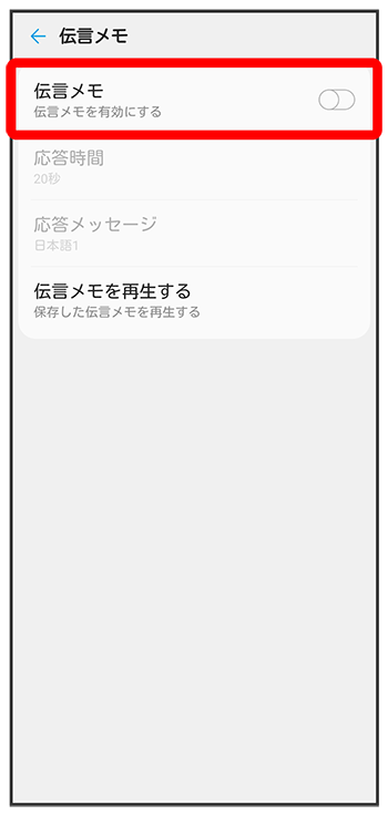 伝言メモ設定画面で応答時間を設定- 電話着信時に、設定した伝言メモの応答時間が経過する前に着信が切断されてしまう場合は、伝言メモの応答時間を短く設定してください。待ち時間の短いサービスが優先されるため、転送電話サービス/留守番電話サービスの待ち時間を長く設定してください。それでも症状が改善されない場合は、転送電話サービス/留守番電話サービスの利用を停止してください。転送電話サービス/留守番電話サービスについて詳しくは、「転送電話サービスを利用する」、「留守番電話サービスを利用する」を参照してください。