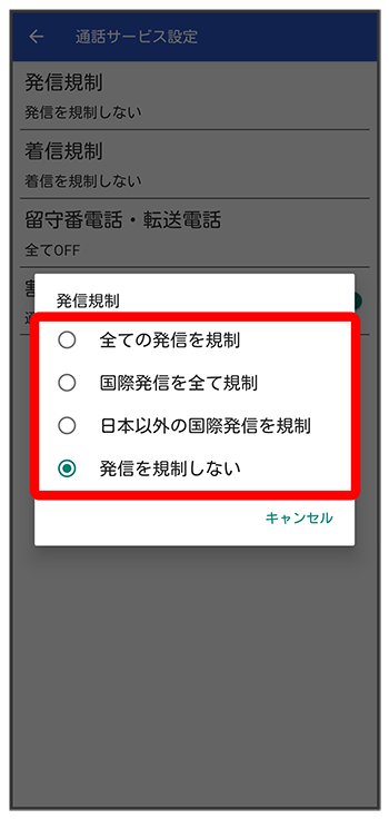- 発着信規制中に電話をかけようとすると、発信できない旨のメッセージが表示されます。お客様がご利用になる地域によっては、表示されるまでに時間がかかることがあります。