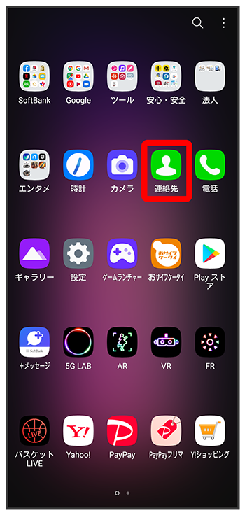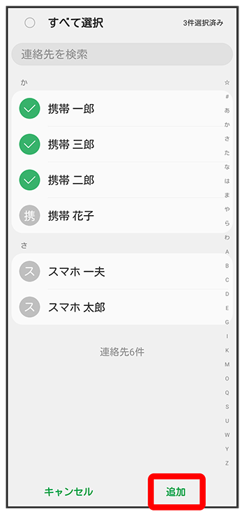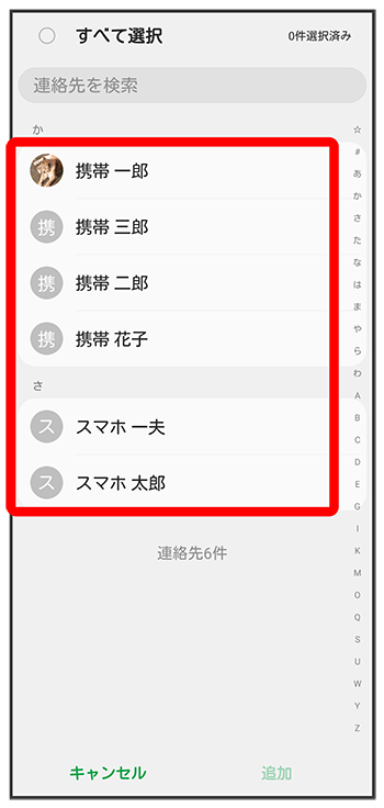 連絡先画面で「グループ」タブをタップ連絡先を追加するグループを選択グループに連絡先が追加されます。