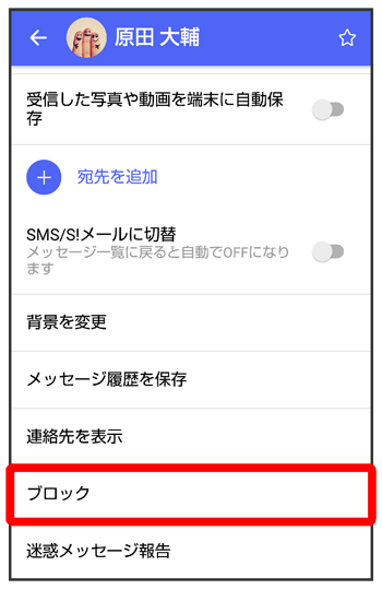 メッセージをブロックすると、ブロックした電話番号/メールアドレスからのメッセージがメッセージ一覧画面に表示されなくなり、受信しても通知されなくなります。ブロックしたメッセージは、ブロックメッセージフォルダに保存されます。また、ブロックした電話番号/メールアドレスへのメッセージの送信ができなくなります。