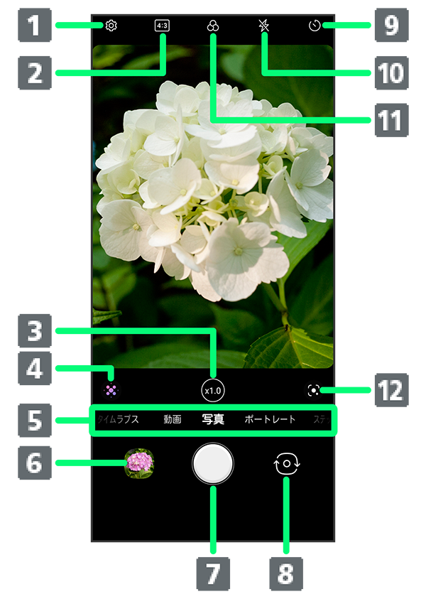 タップするとズームレンズと広角レンズを切り替えることができます。また左右にドラッグしてズーム倍率を設定します。 - 認識アイコン
