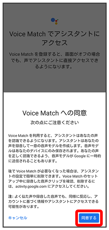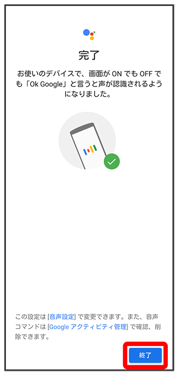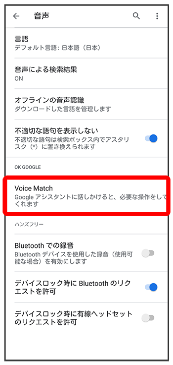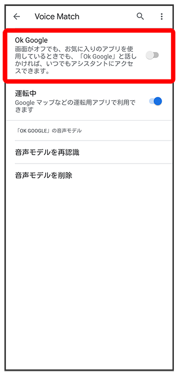 Voice Match機能がONに設定され、音声操作の設定が完了します。