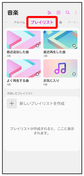 ミュージックライブラリ画面で「プレイリスト」タブをタップ「作成したプレイリスト」欄のいずれかのプレイリストをタップいずれかの曲をタップ音楽再生画面が表示され、曲が再生されます。