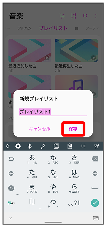 ミュージックライブラリ画面で「プレイリスト」タブをタップいずれかの曲をタッププレイリストに曲を追加する