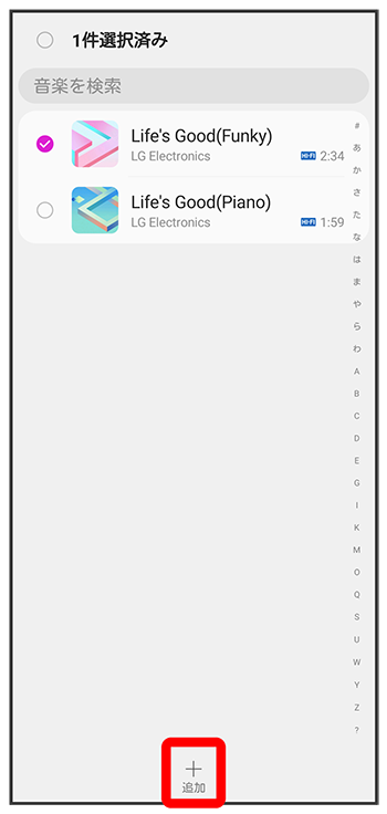 表示)追加したいリストをタップしても、曲をプレイリストに追加できます。 - をタップすると、すべての曲を選択/解除できます。
