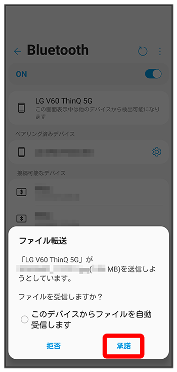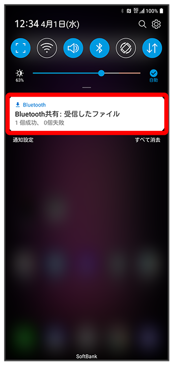 Bluetooth®機器からデータの受信要求があると、画面に通知が表示されます。次の操作を行うと、受信することができます。