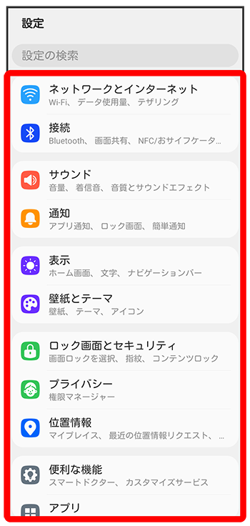 | ネットワークとインターネット | Wi-Fiやモバイルネットワーク、データ使用量など、ネットワークやインターネットに関する設定ができます。 |