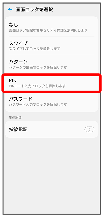 PINで画面ロックを解除するように設定する