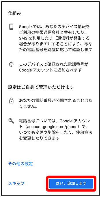 - 電話番号の追加をしないときはをタップします。