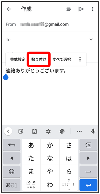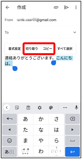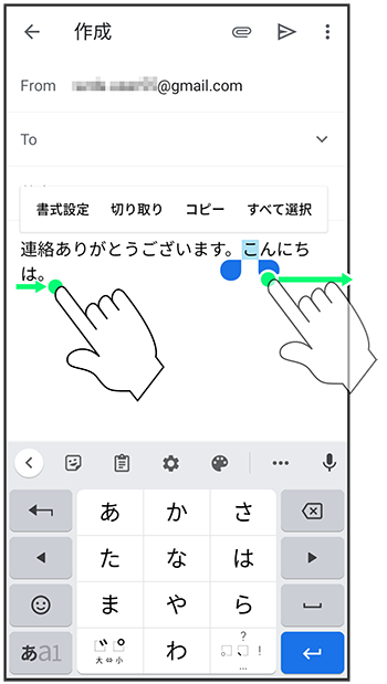 文字入力画面で入力済みの文字や、ウェブサイトの文字をダブルタップ/ロングタッチすると、文字列がハイライト表示されて編集メニューが表示されます。表示される編集メニューの項目は、アプリによって異なります。