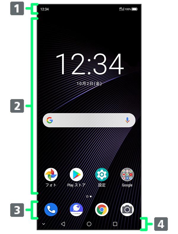 | ステータスバー | 下にフリック/スワイプすると、通知パネルを表示します。2本指で下にフリック/スワイプすると、クイック設定パネルを表示します。 |