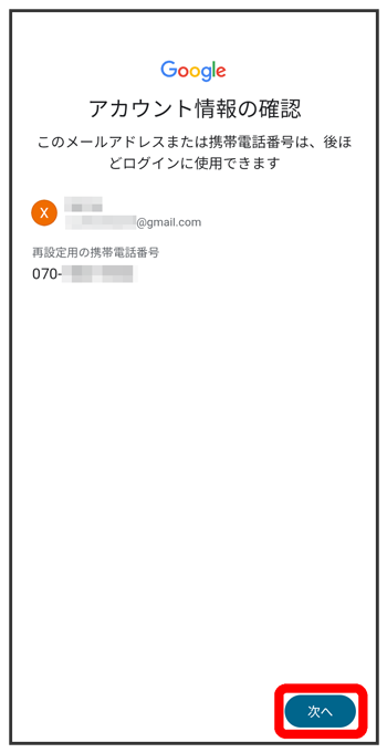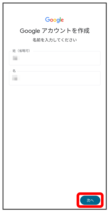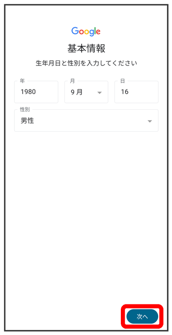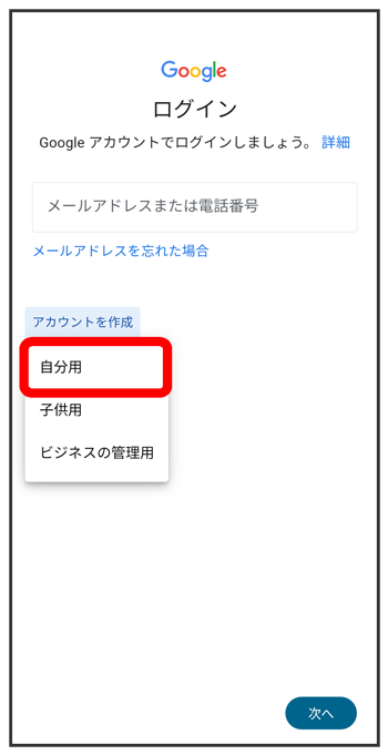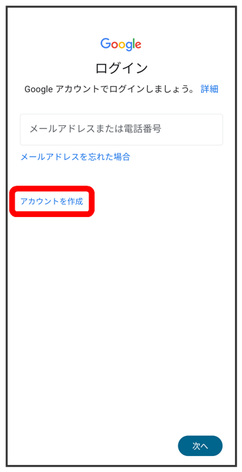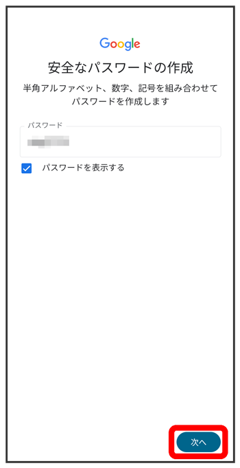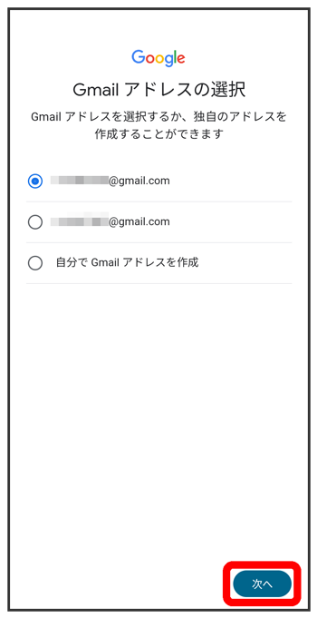 - 自分でGmail™ アドレスを作成する場合は、ユーザー名(メールアドレス)を入力と操作します。