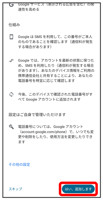 - 電話番号の追加について利用目的を設定する場合は、をタップします。以降は画面の指示に従って操作してください。