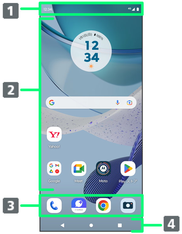 | カスタマイズエリア | アプリのショートカットやフォルダ、ウィジェットを自由に配置できます。 |