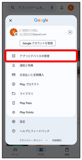 Google Play画面で右上のアカウントアイコンをタップアプリをタップ- アプリによっては、自動更新を有効にできないものもあります。