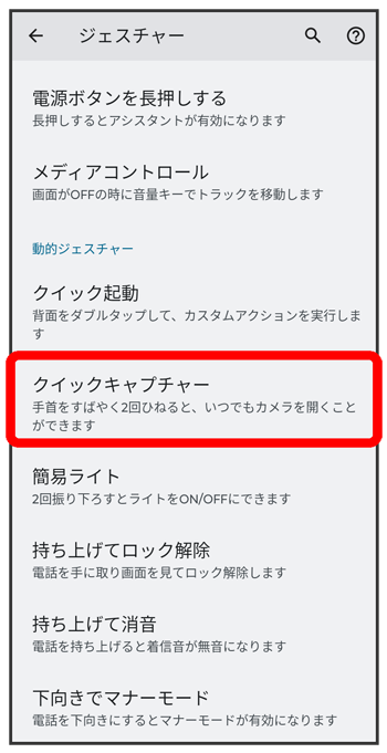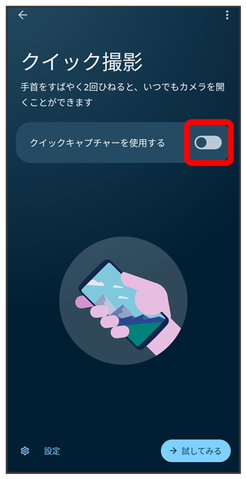 クイックキャプチャーを有効にすると、手首をすばやく2回ひねるだけでカメラを起動することができます。