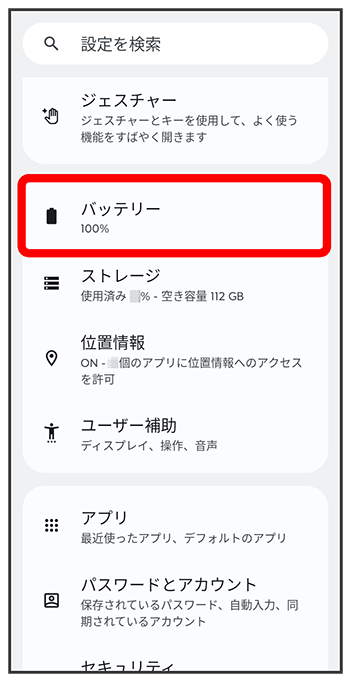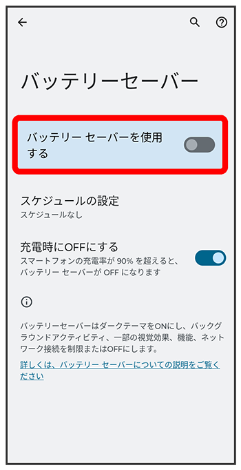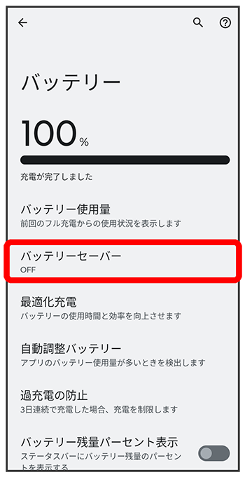 - と操作すると、電池残量に応じてバッテリーセーバーを有効にすることができます。