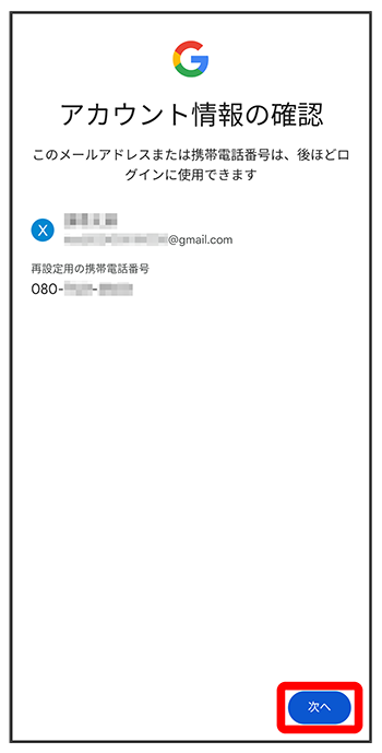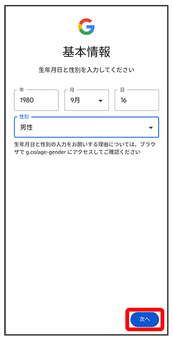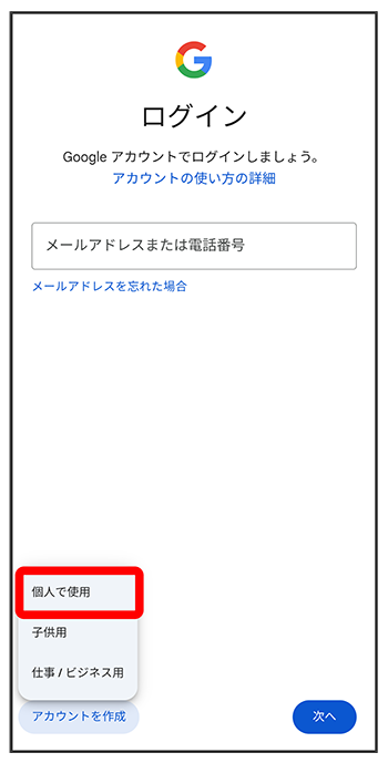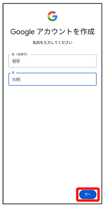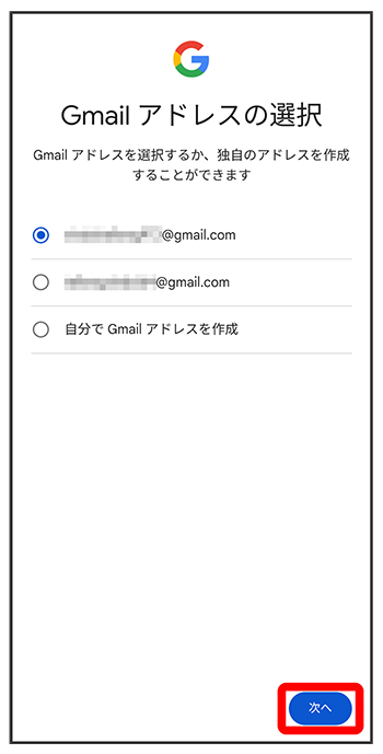 - 自分でGmail™ アドレスを作成する場合は、ユーザー名(メールアドレス)を入力と操作します。