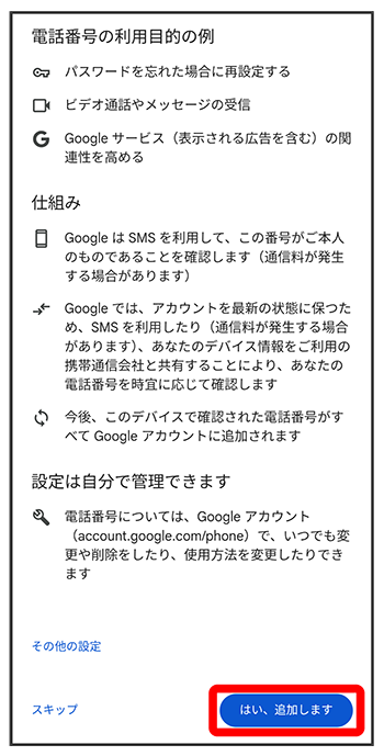 - 電話番号の追加について利用目的を設定する場合は、をタップします。以降は画面の指示に従って操作してください。