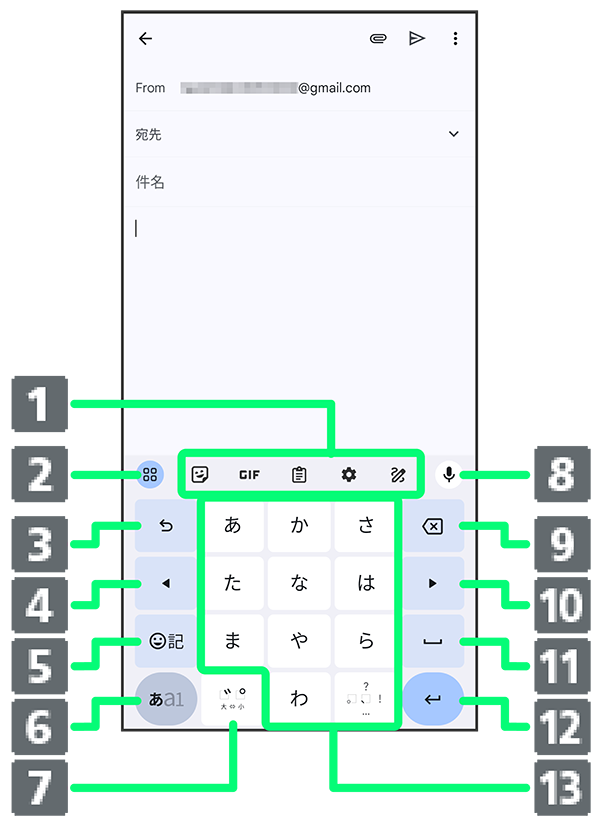 - 文字入力モードを切り替えます(ひらがな/半角英字/数字)。ロングタッチすると文字入力の設定画面を表示したり、片手モードを設定できます。