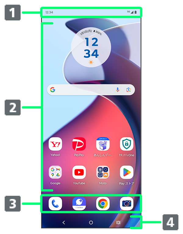 | ステータスバー | 下にフリックすると、通知パネルを表示します。2本指で下にフリックすると、クイック設定パネルを表示します。 |