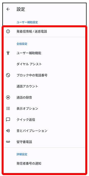 | 発着信情報/迷惑電話 | ・発信者番号とスパムの番号を表示 連絡先にない電話番号の発信者名を表示するかどうかを設定します。 ・迷惑電話をブロック 迷惑電話の疑いがある通話をブロックします。 |