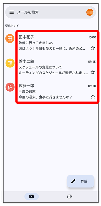 メール一覧画面で未読にするメールをロングタッチメールを削除する