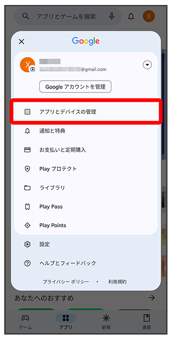 Google Play画面で右上のアカウントアイコンをタップアプリをタップ- アプリによっては、自動更新を有効にできないものもあります。