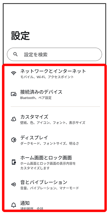 | ネットワークとインターネット | Wi-Fiやモバイルネットワーク、データ使用量など、ネットワークやインターネットに関する設定ができます。 |