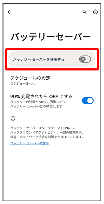 - と操作すると、電池残量に応じてバッテリーセーバーを有効にすることができます。