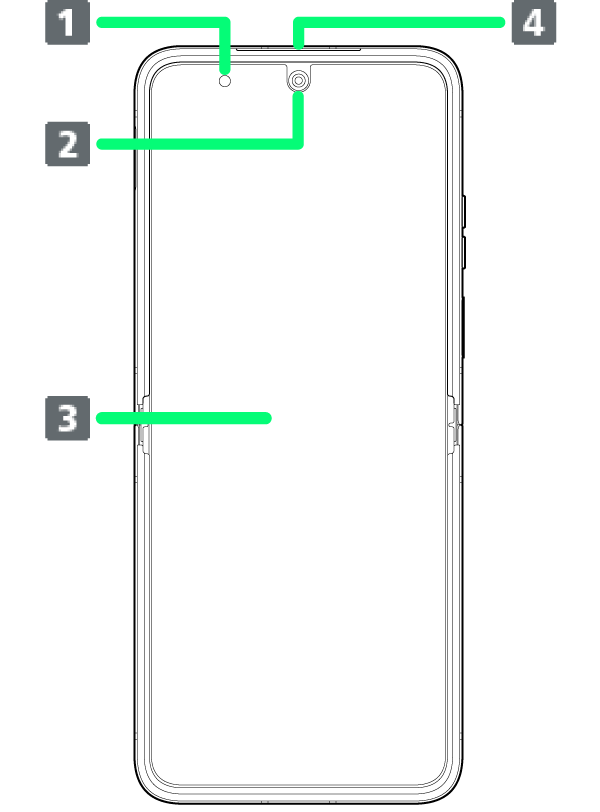| 近接/環境照度センサー | 通話中に頭部の接近を感知し、メインディスプレイの消灯/点灯を切り替えたり、画面の明るさの自動調節に使用します。 |