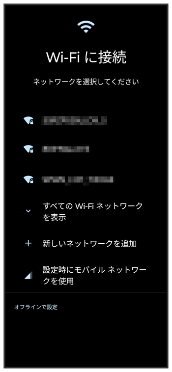 - USIMカードのご利用中にWi-Fiの設定を省略するときは、/を選択します。以降は、画面の指示に従って操作してください。