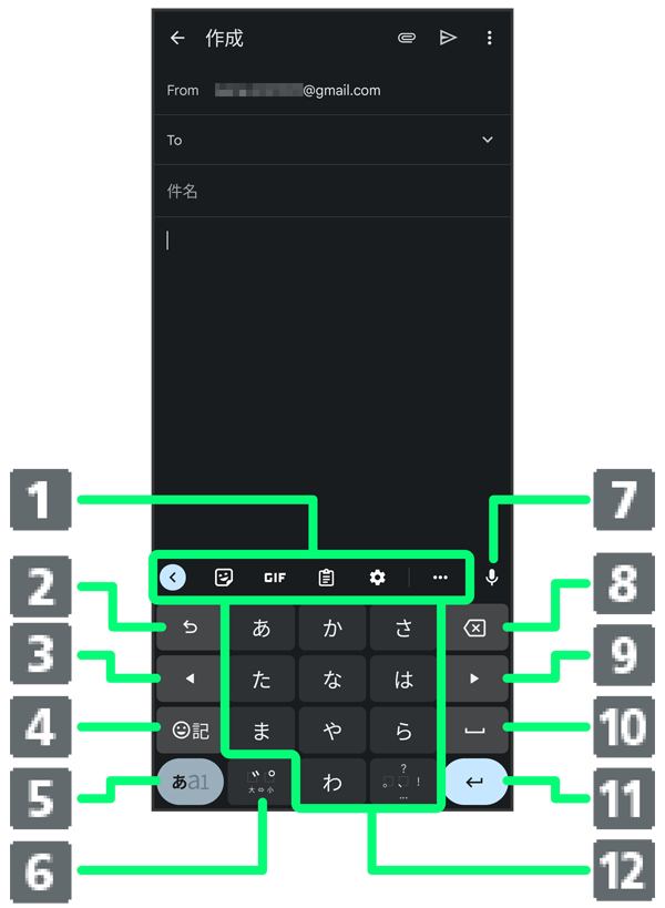 - 文字入力モードを切り替えます(ひらがな/半角英字/数字)。ロングタッチすると文字入力の設定画面を表示したり、片手モードを設定できます。