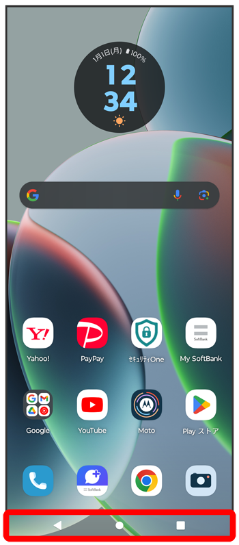 | ホーム画面を表示します。 ロングタッチすると Google アシスタントを起動できます。 | |