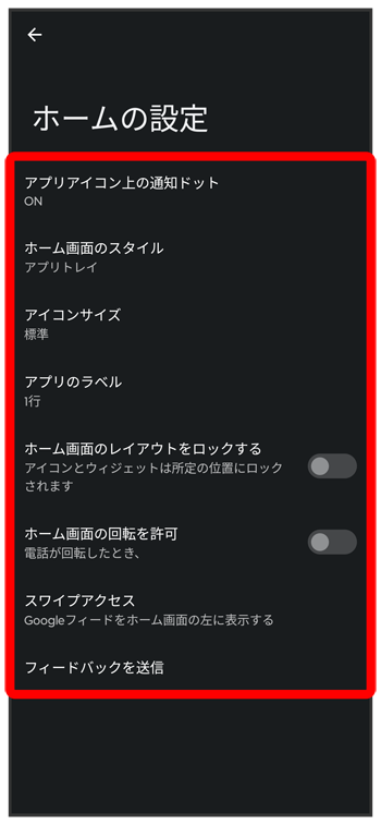 | スワイプアクセス | Google フィードをホーム画面の左に表示するかどうかを設定できます。 |