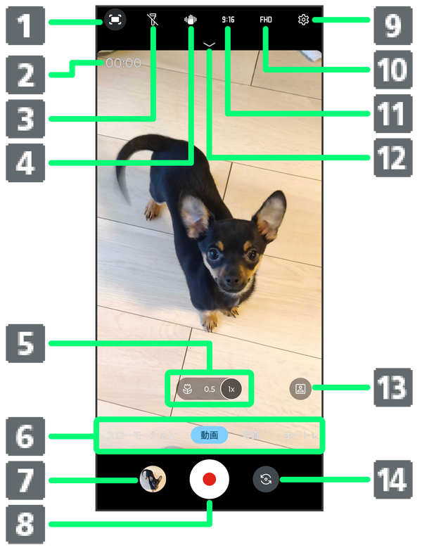 が選択されている状態のときに左右にドラッグすると、ズーム倍率を変更できます。 - 撮影モード切り替え
