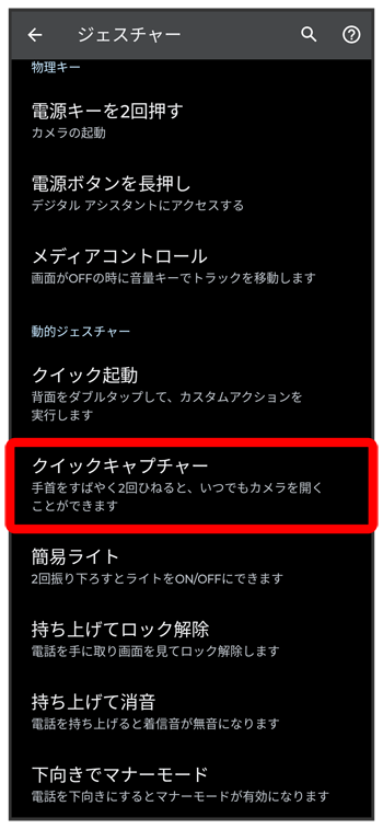 クイックキャプチャーを有効にすると、手首をすばやく2回ひねるだけでカメラを起動することができます。