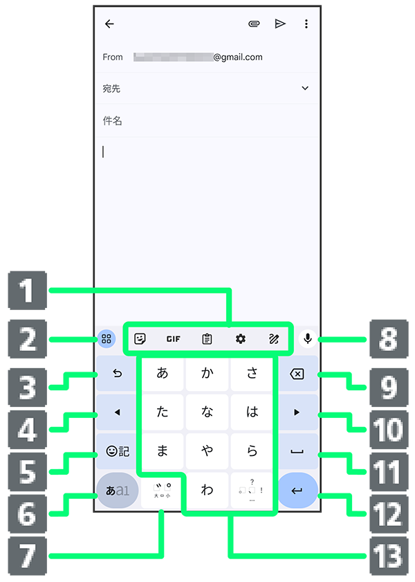 - 文字入力モードを切り替えます(ひらがな/半角英字/数字)。ロングタッチすると文字入力の設定画面を表示したり、片手モードを設定できます。