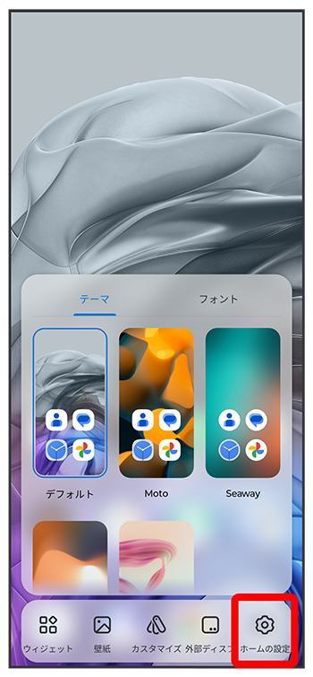 | 整理されたコンテンツ | ホーム画面をロングタッチして、テーマやフォントなどを表示するかどうかを設定します。 |