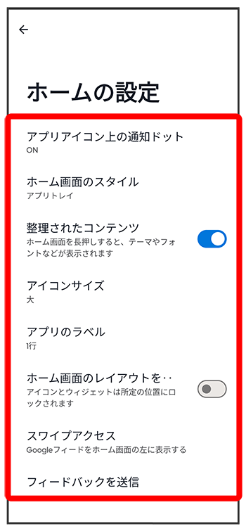 | スワイプアクセス | Google フィードをホーム画面の左に表示するかどうかを設定できます。 |