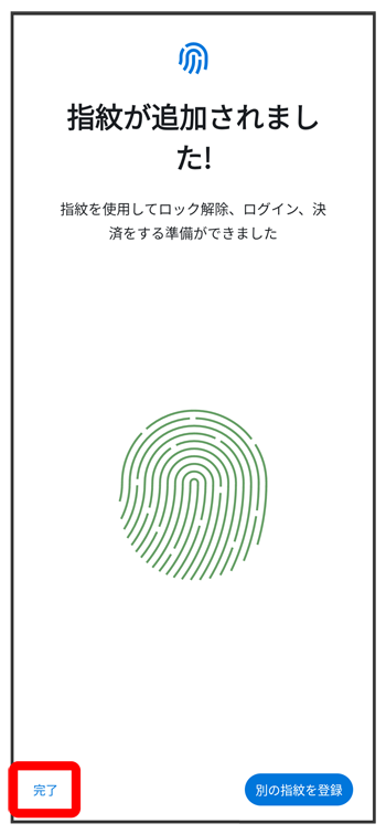 - 続けて別の指紋を登録する場合は、をタップします。