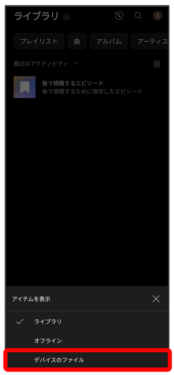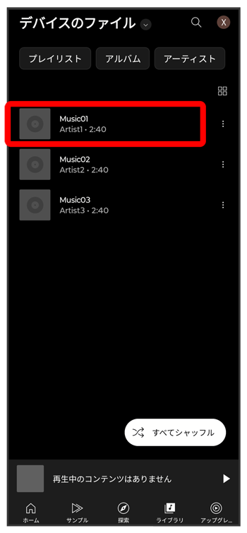 - /をタップすると、アルバム/アーティスト名が一覧で表示されます。アルバム/アーティスト名をタップしてから、曲名をタップすると曲が再生されます。