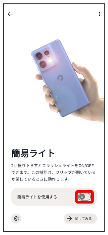 をタップすると、ライトのON/OFF時に本機を振動させるかどうかを設定できます。- をタップすると、簡易ライトのジェスチャー操作を試すことができます。